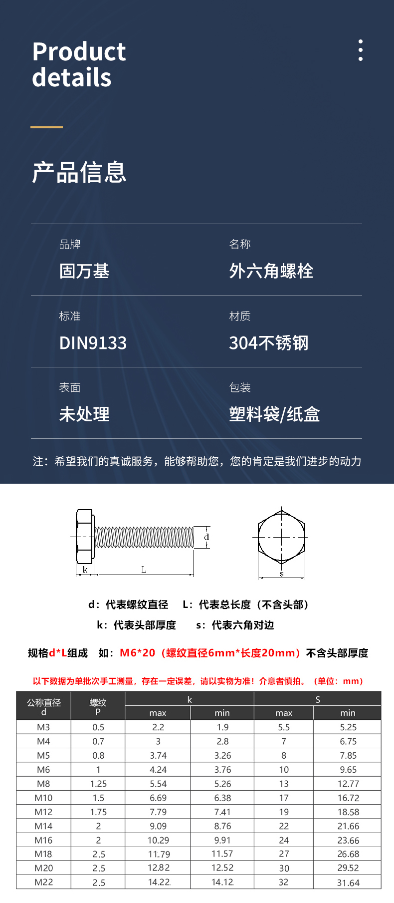 GUWANJI(固万基) 304不锈钢外六角螺丝加长DIN933六角螺栓螺丝钉大全 M12*100 SZ126132