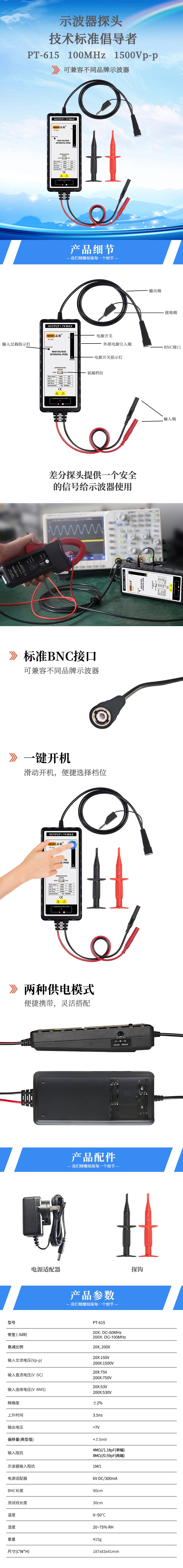 PINTECH品致DC-100MHz差分探头PT-615,1500Vp-p
