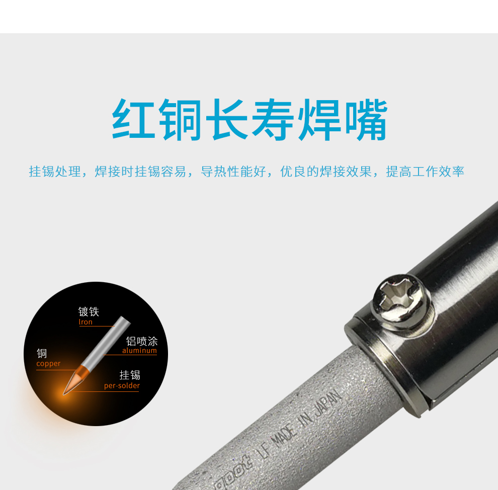 2 红铜长寿焊嘴:焊嘴经过挂锡处理,焊接时挂锡容易,导热性能好,提供优良的焊接效果,显著提高工作效率。