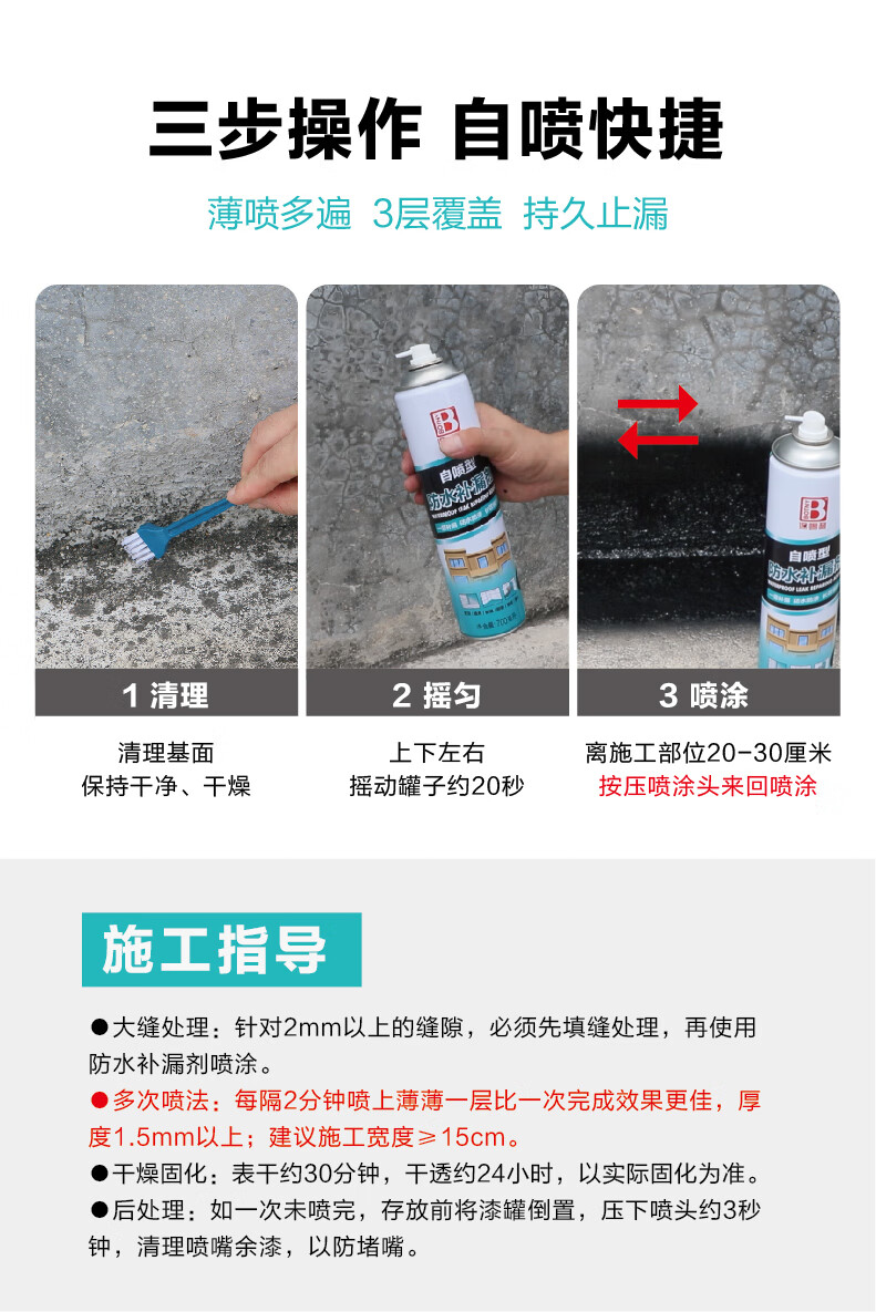 对于2mm以上的缝隙,建议先进行填缝处理,再使用防水补漏剂喷涂。