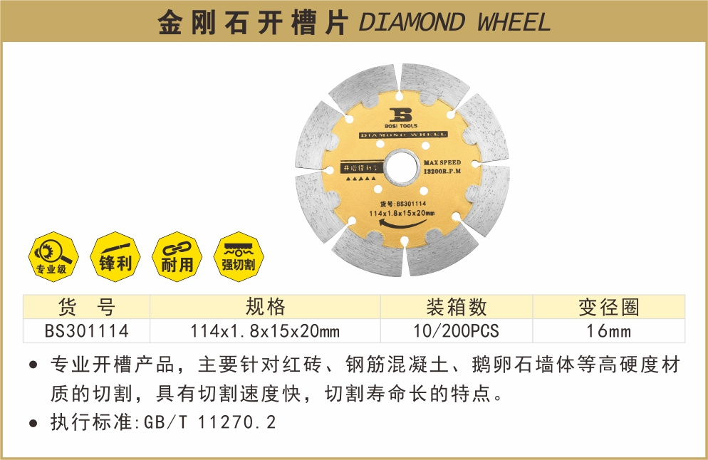 BOSI(波斯) BS301114 金刚石开槽片是一款专为高硬度材料切割设计的专业级工具。