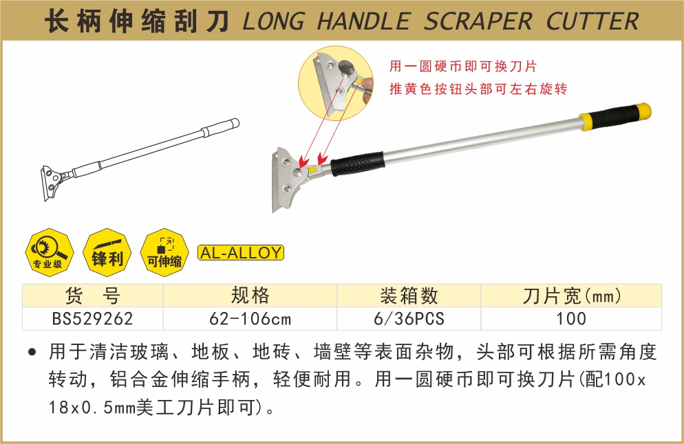 专业级设计:该长柄伸缩刮刀采用专业级设计,适用于各种表面清洁工作,确保高效作业。