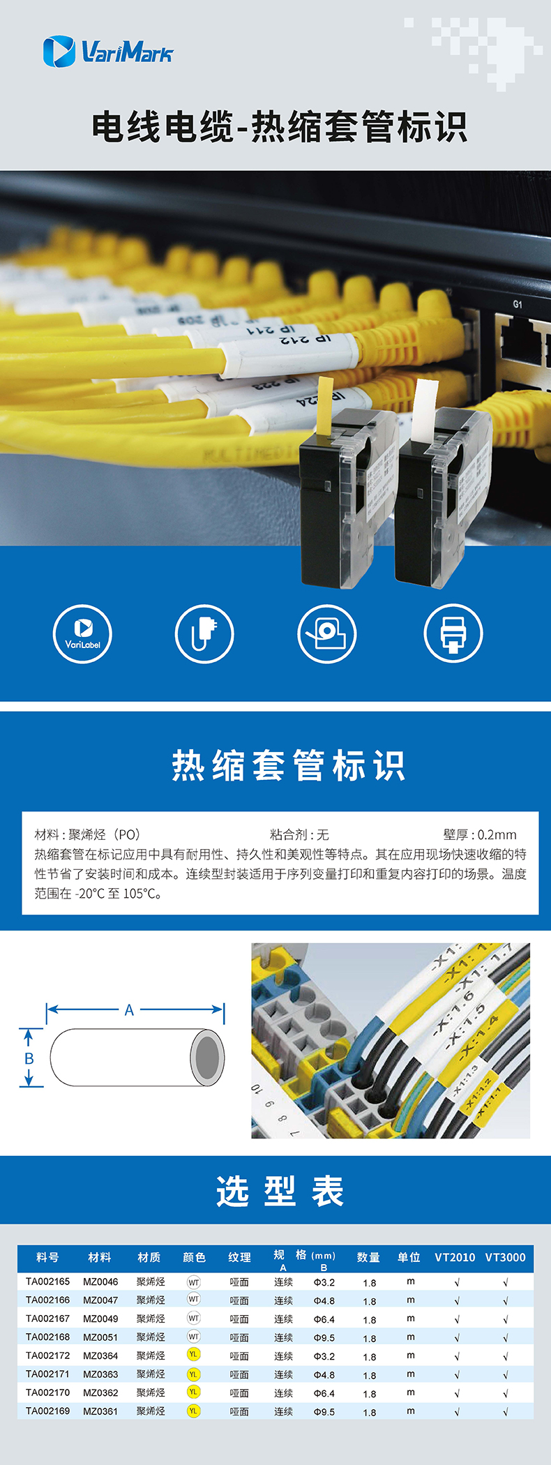 VariMark/威码VT2010/VT3000标签打印机热缩套管标识标签线缆专用标识材料无卤阻燃符合法律法规 TA002169 φ9.5mmX1.8M-黄底黑字