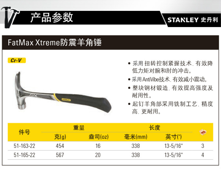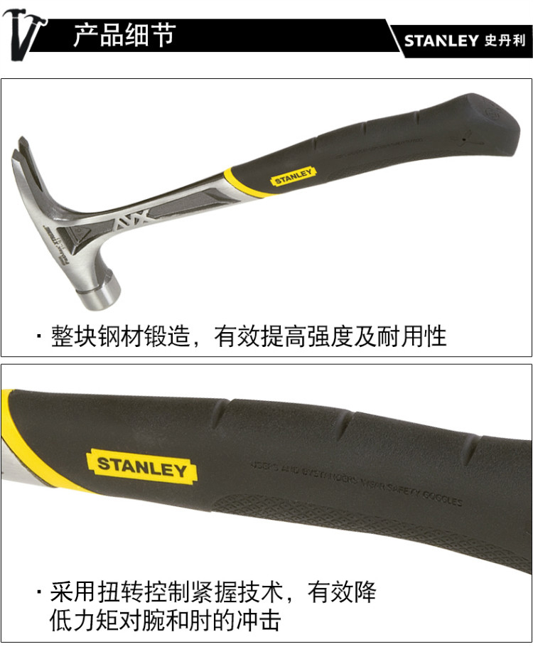 STANLEY(史丹利),FatMax XTREME防震羊角锤起钉铁锤子装修钢柄榔头锤子安装锤,51-163-22