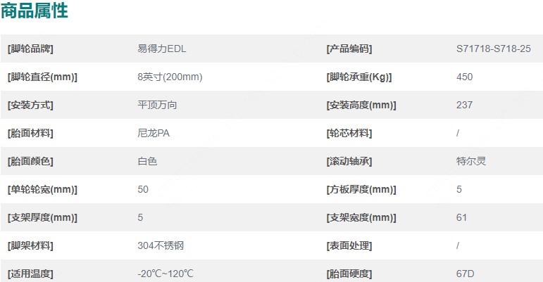 EDL(易得力)不锈钢8"平顶万向尼龙PA脚轮