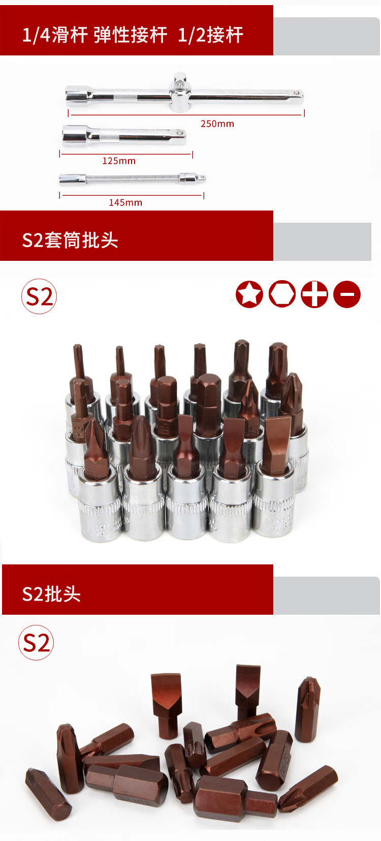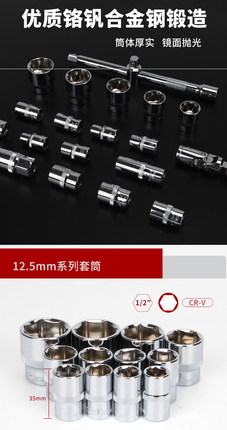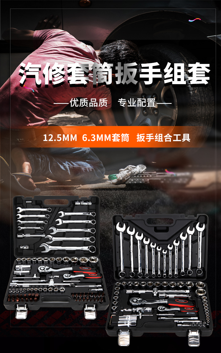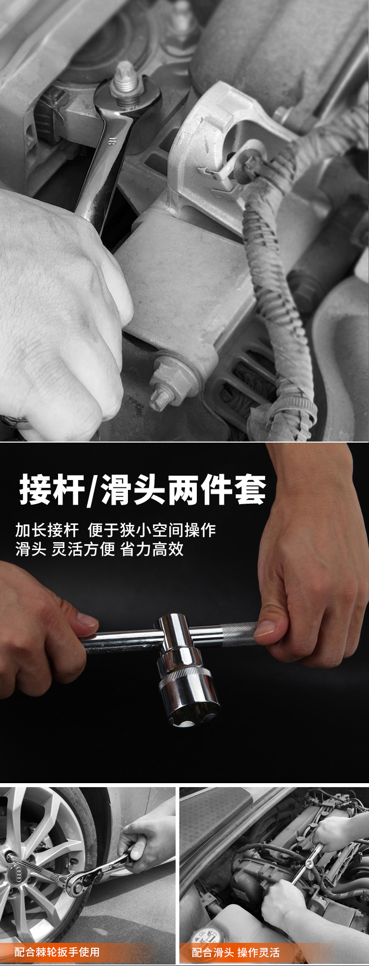 3 多功能组合:包含两用扳手、套筒、滑杆、接杆等多种工具,适用于不同维修需求。