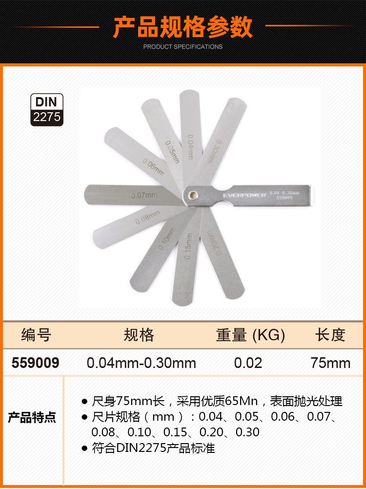 EVERPOWER(艾威博尔),9件套塞尺0.04mm-0.30mm,559009