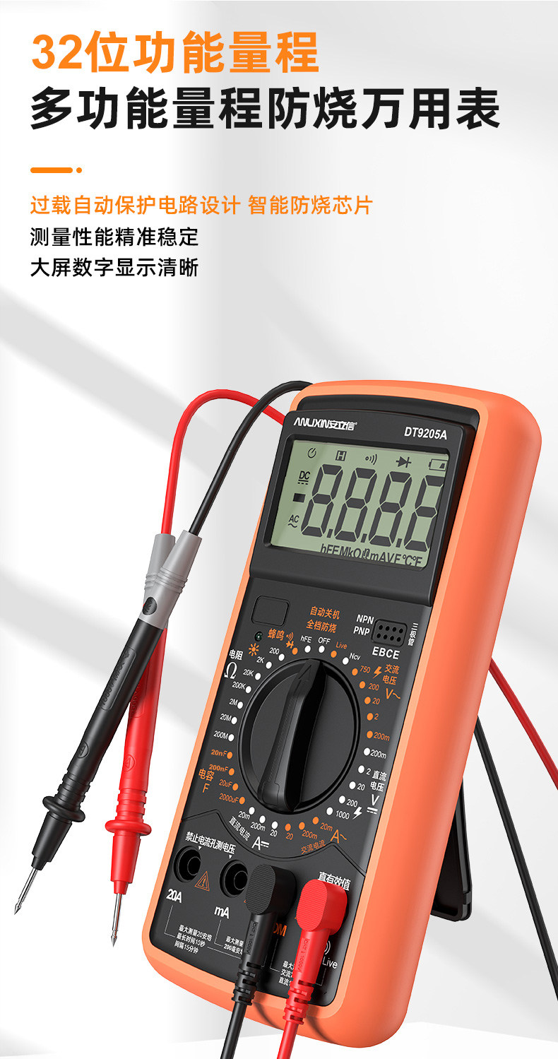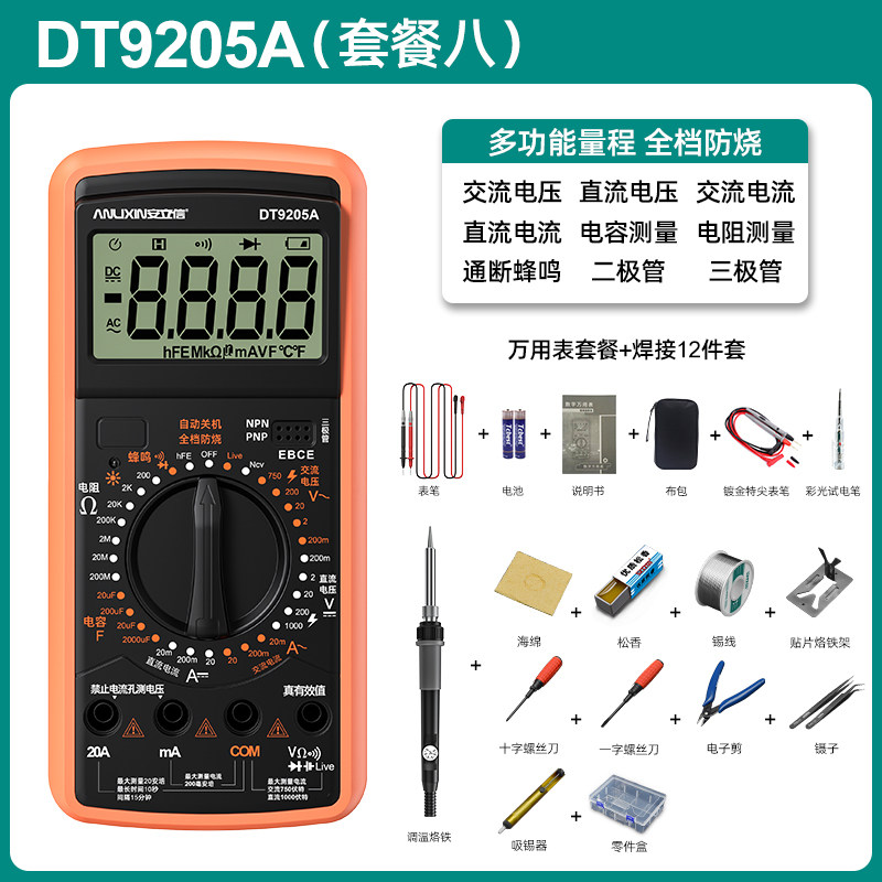 ANLIXIN(安立信) 多功能量程防烧万用表(DT9205A)套餐八 ALX-WYB-9205A-8 含(布包+镀金特尖表笔+彩光试电笔++调温烙铁+海绵+锡线+松香+贴片烙铁架+十字螺丝刀+一字螺丝刀+电子钳+镊子+吸锡器+零件盒)