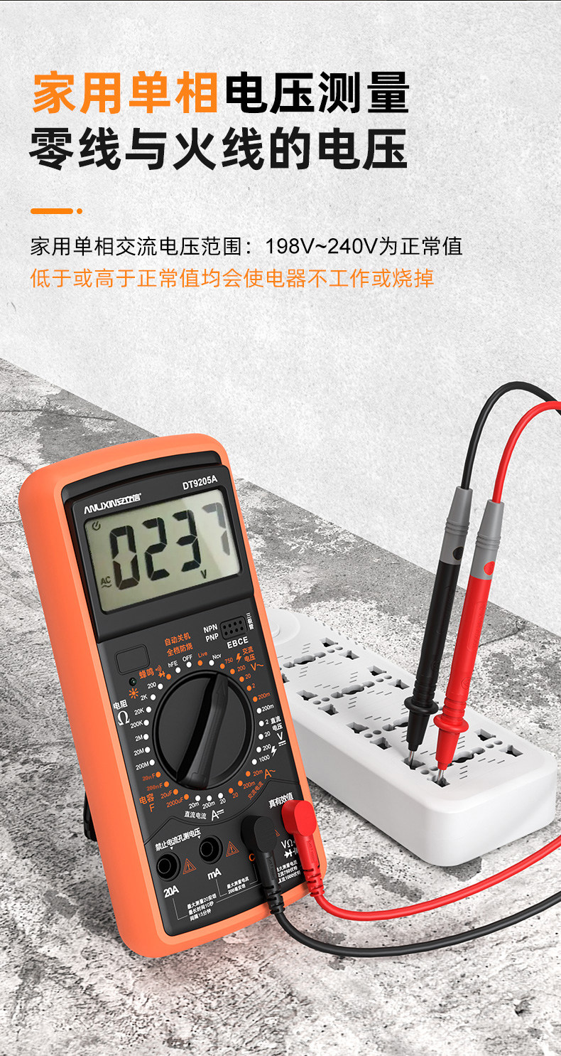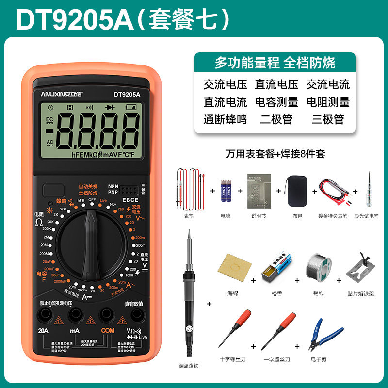 ANLIXIN(安立信) 多功能量程防烧万用表(DT9205A)套餐七 ALX-WYB-9205A-7 含(布包+镀金特尖表笔 彩光试电笔 调温烙铁 海绵 锡线 松香 贴片烙铁架 十字螺丝刀 一字螺丝刀 电子钳)