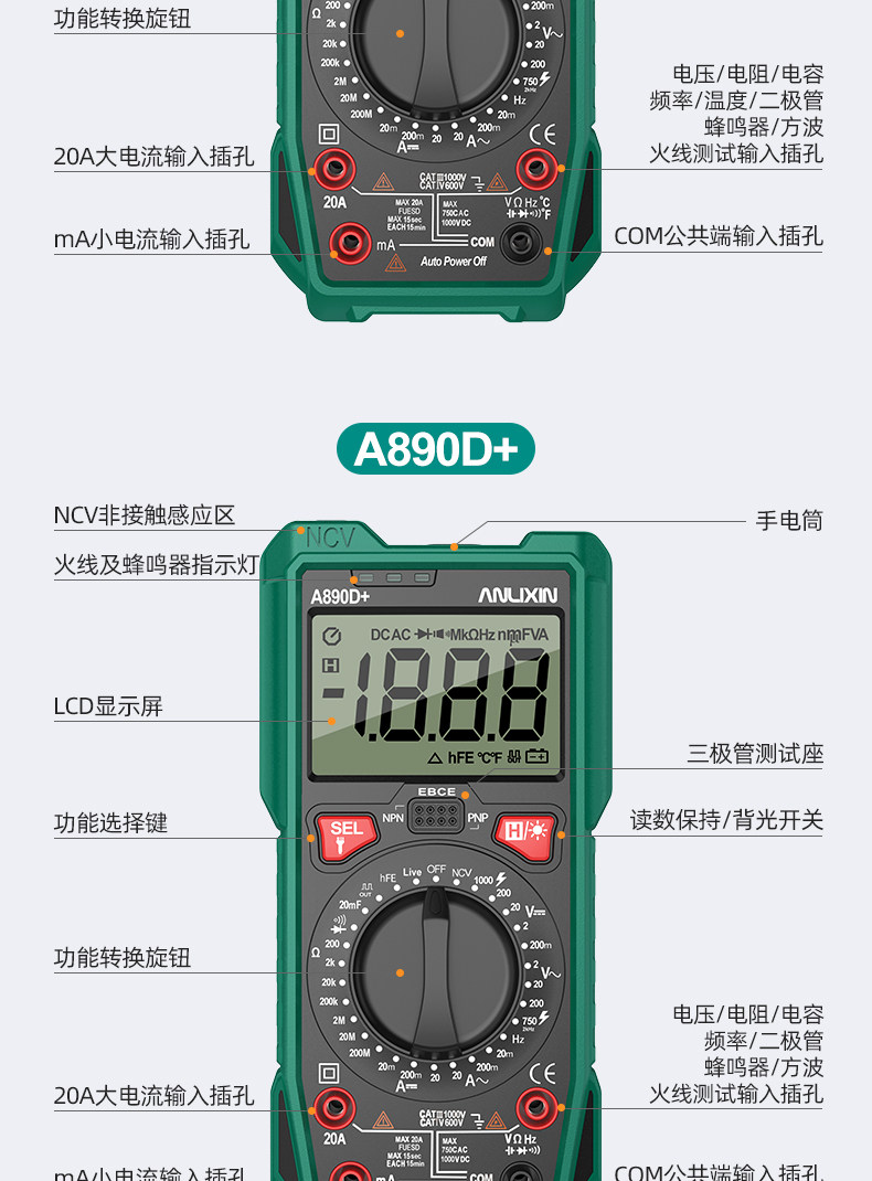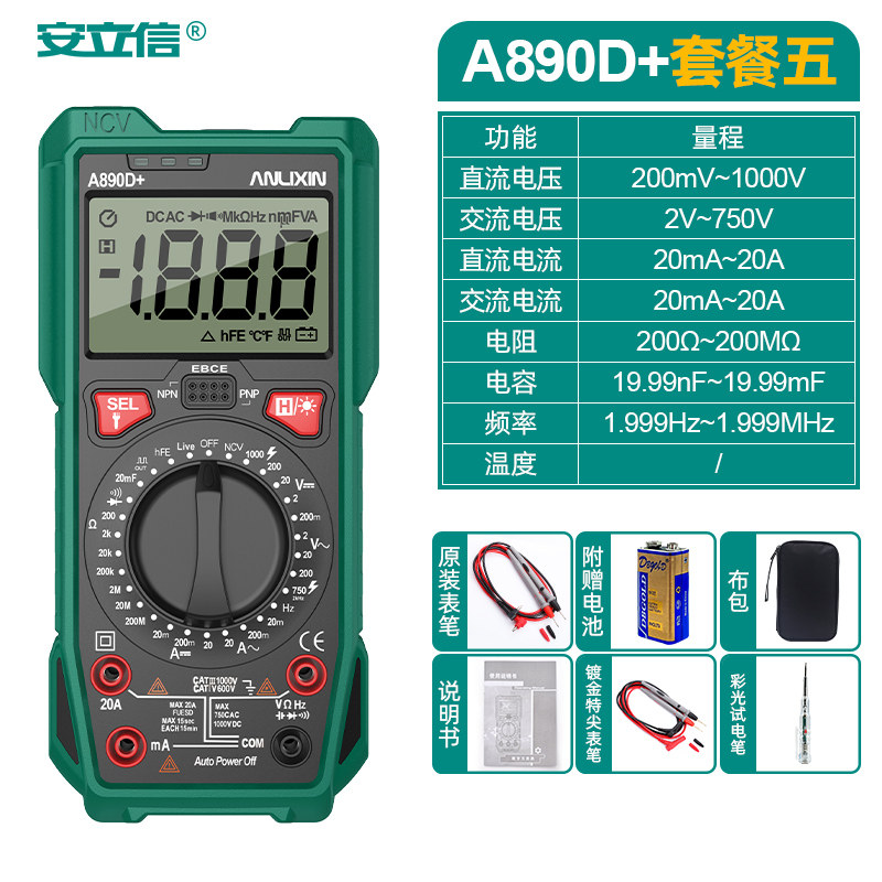 ANLIXIN(安立信) 智能防烧A890D+万用表(套餐五) ALX-A890D+5 含(布包+镀金特尖表笔+彩光试电笔)