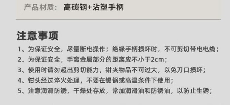 | 材质 | 高碳钢钳体,PVC手柄 |