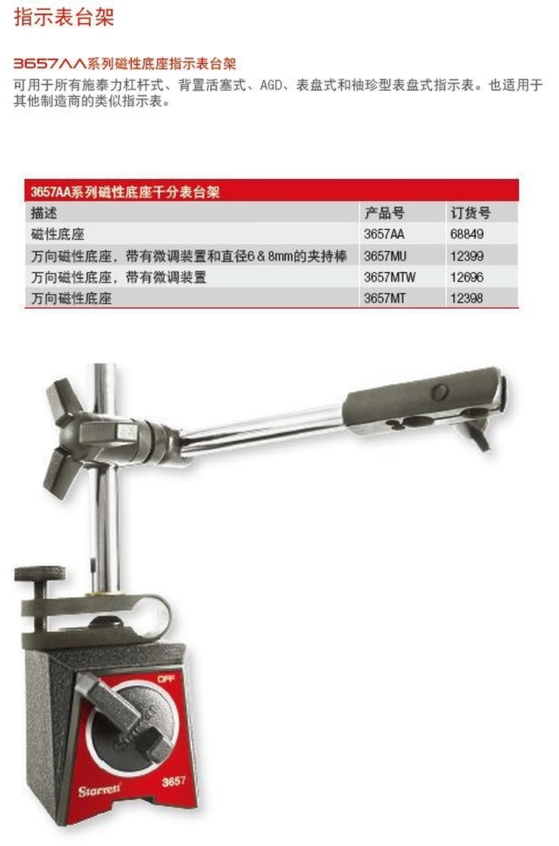 底座类型多样:提供多种规格底座选择,包括基础磁性底座(3657AA)、带微调装置和6&8mm夹持棒的万向磁性底座(3657MU)、带微调装置的万向磁性底座(3657MTW)、万向磁性底座(3657MT)