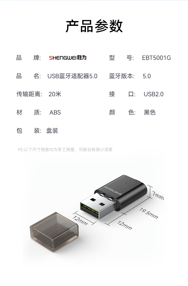 本款shengwei(胜为)EBT5001G USB蓝牙适配器5.0采用高性能蓝牙5.0芯片,支持2.5Mbps高速数据传输,有效传输距离可达20米,满足日常办公与家庭使用需求。内置天线设计增强信号稳定性,确保无线连接稳定顺畅。支持7个蓝牙设备同时连接,提升多设备协同效率。产品具备免驱设计,即插即用,兼容Windows 8及以上系统,Win7和XP需手动安装驱动程序。配备蓝色工作指示灯,实时显示运行状态,方便用户掌握设备工作情况。首次配对后支持记忆功能,重启电脑可自动连接,提升使用便捷性。产品通过SRRC无线认证,发射功率符合标准,安全可靠。外壳采用ABS材质,黑色外观简洁耐用,尺寸小巧(19.5mm×12mm×7mm),便于携带和长期插入USB接口。附带透明保护盖,防止接口灰尘污染,使用寿命。