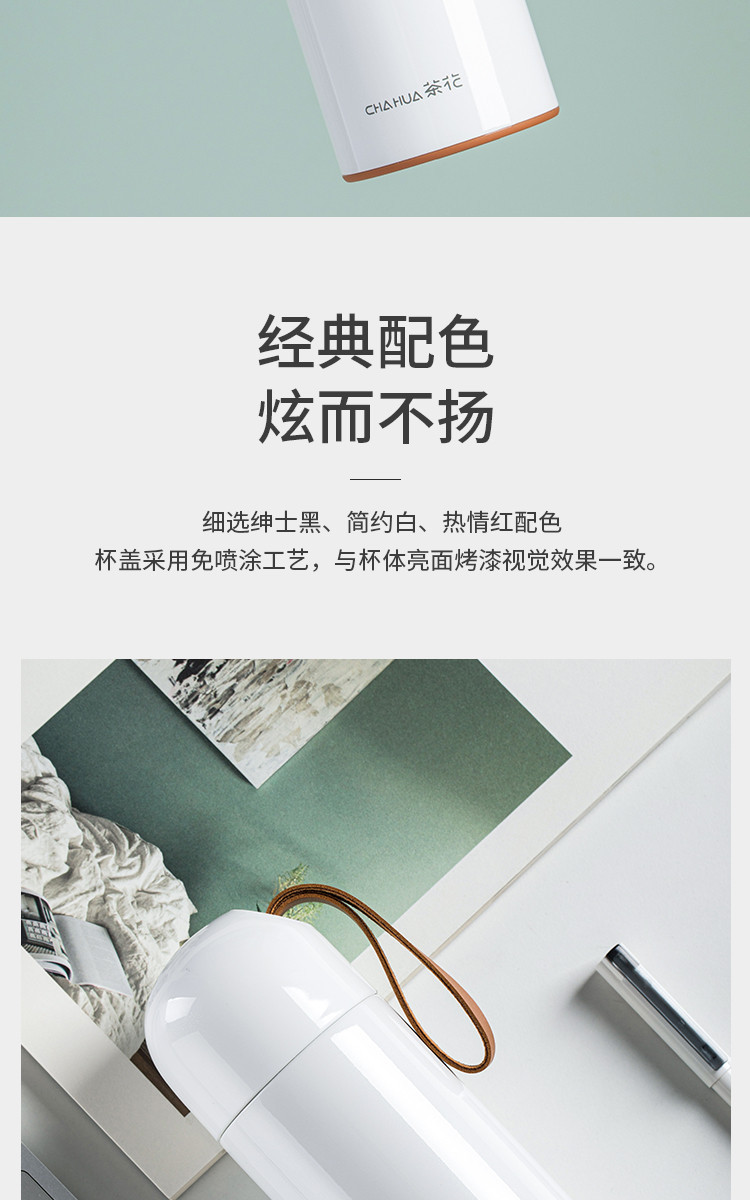4 经典配色选择,包括绅士黑、简约白、热情红,杯盖采用免喷涂工艺,与杯体亮面烤漆视觉效果一致,外观时尚。