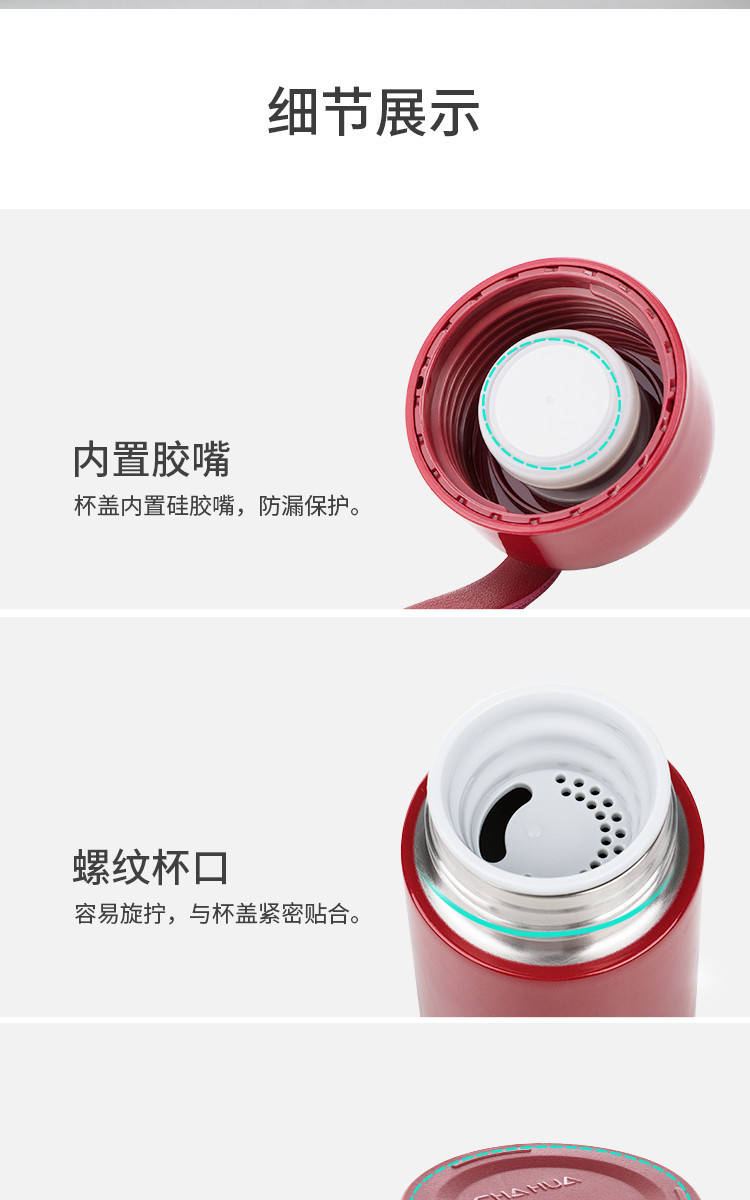 5 内置硅胶嘴和螺纹杯口设计,确保密封性,防止漏水,同时便于旋拧。