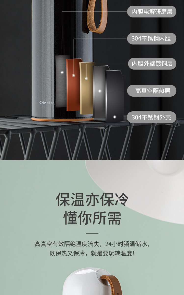2 多重‘芯’技术,五重保温壁垒设计,包括内胆电解研磨层、304不锈钢内胆、内胆外壁镀铜层、高真空隔热层和304不锈钢外壳,实现高效保温保冷效果。
