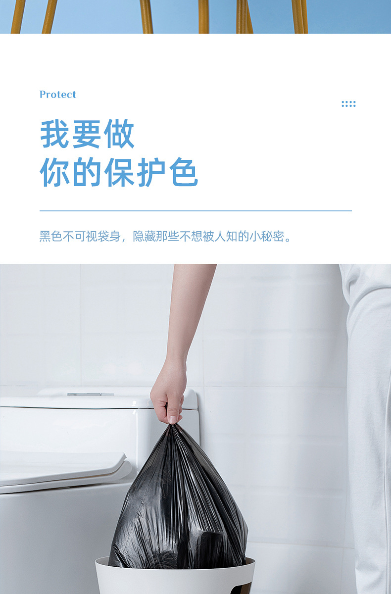 3 卫生间:黑色款垃圾袋可以隐藏垃圾,保护隐私,同时其密封性好,防止异味扩散。