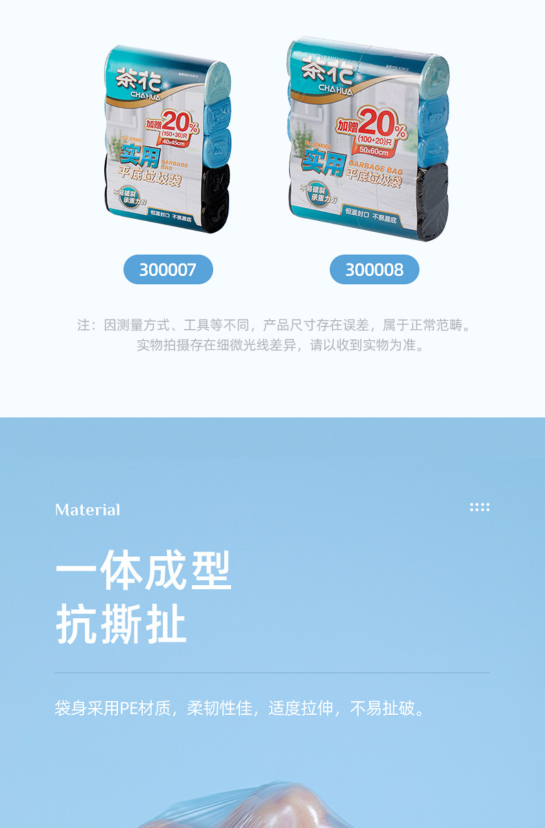 1 采用HDPE和LDPE材质,确保垃圾袋具有优异的韧性和耐用性,能够有效防止撕裂和穿孔。