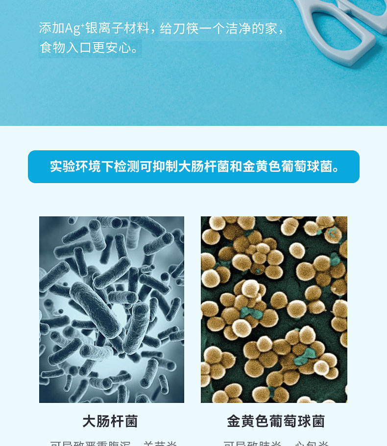 2 独特的银离子抗菌技术,有效抑制大肠杆菌和金黄色葡萄球菌,保障餐具卫生。