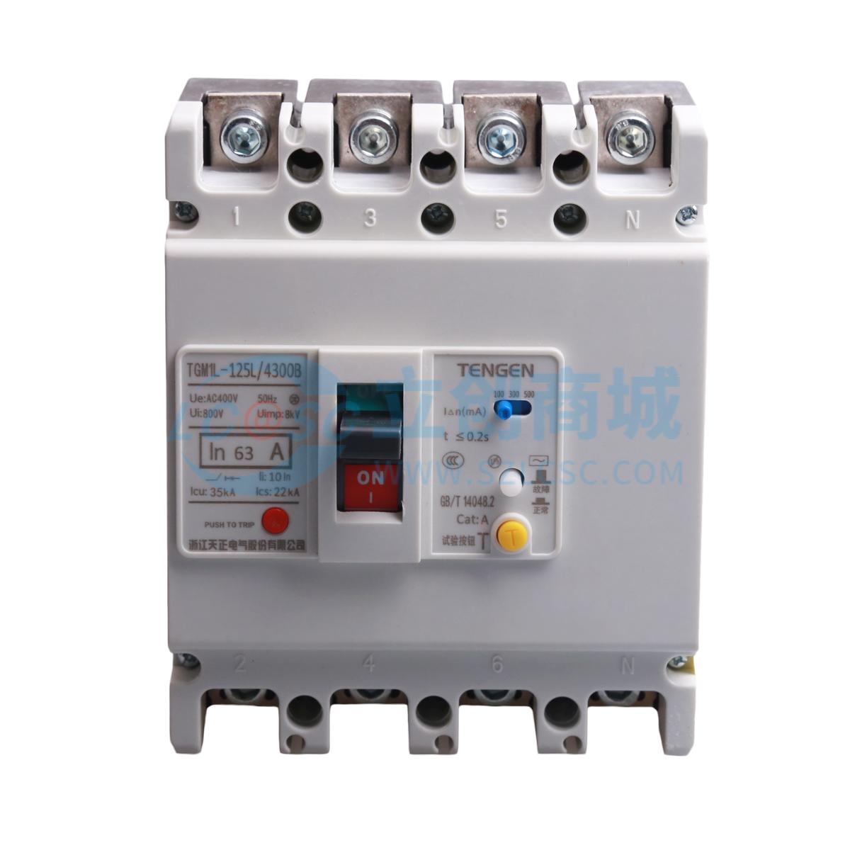 1 品牌型号:TENGEN(天正电气)TGM1L-125L/4300B 63A塑壳漏电断路器,属于TGM1L系列,采用国际先进技术设计,集成断路器与剩余电流保护功能。