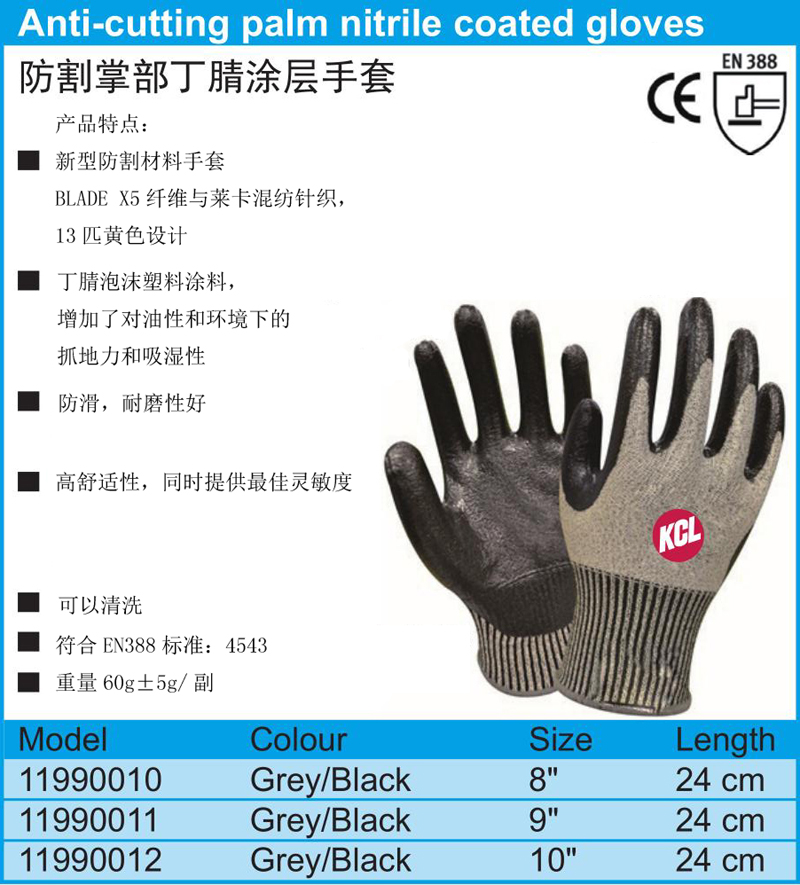 防割掌部丁腈涂层手套KT11-990-12采用BLADE X5纤维与莱卡混纺针织,提供卓越的防割性能。