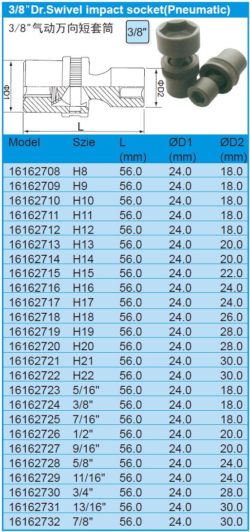 KENTA(克恩达) KT16-162-717 3/8"气动万向短套筒具有以下特点:
