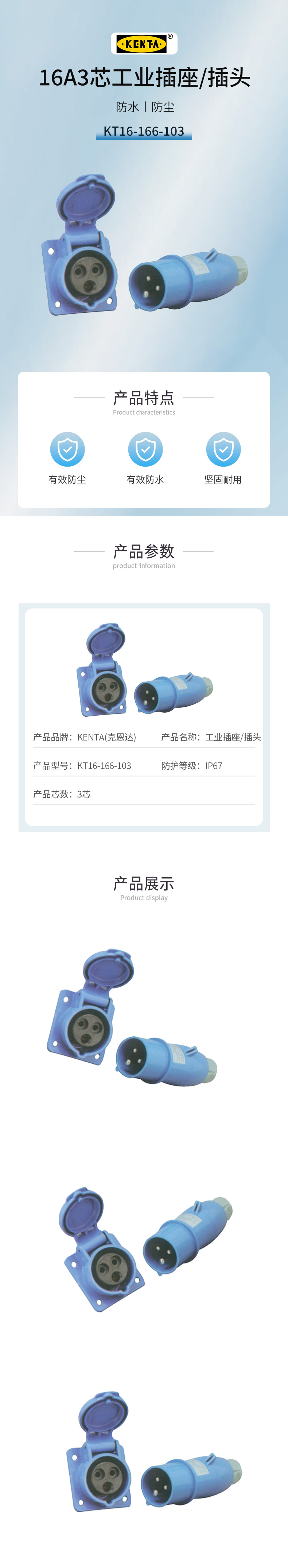 KENTA(克恩达) KT16-166-103 16A 3芯工业插座/插头采用高强度工程塑料外壳,具备出色的抗冲击和耐腐蚀性能,适用于严苛的工业环境。