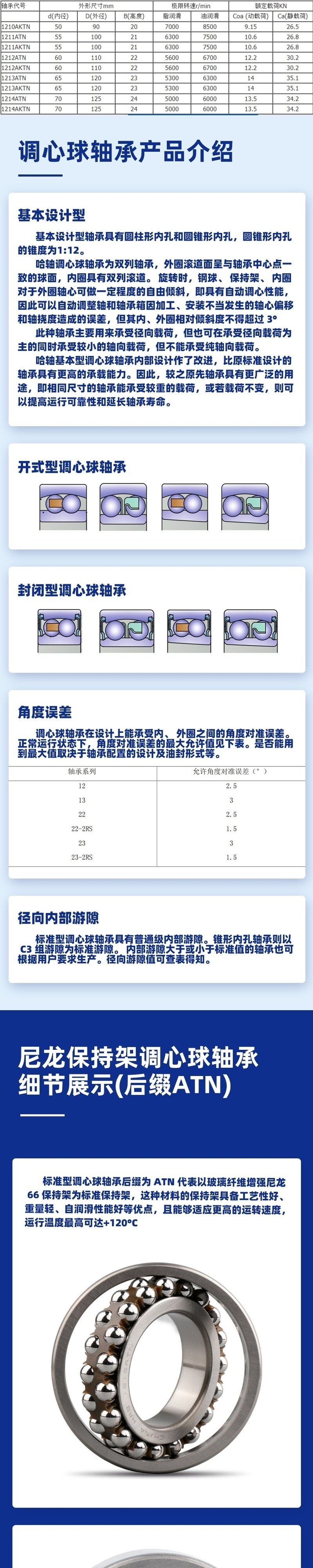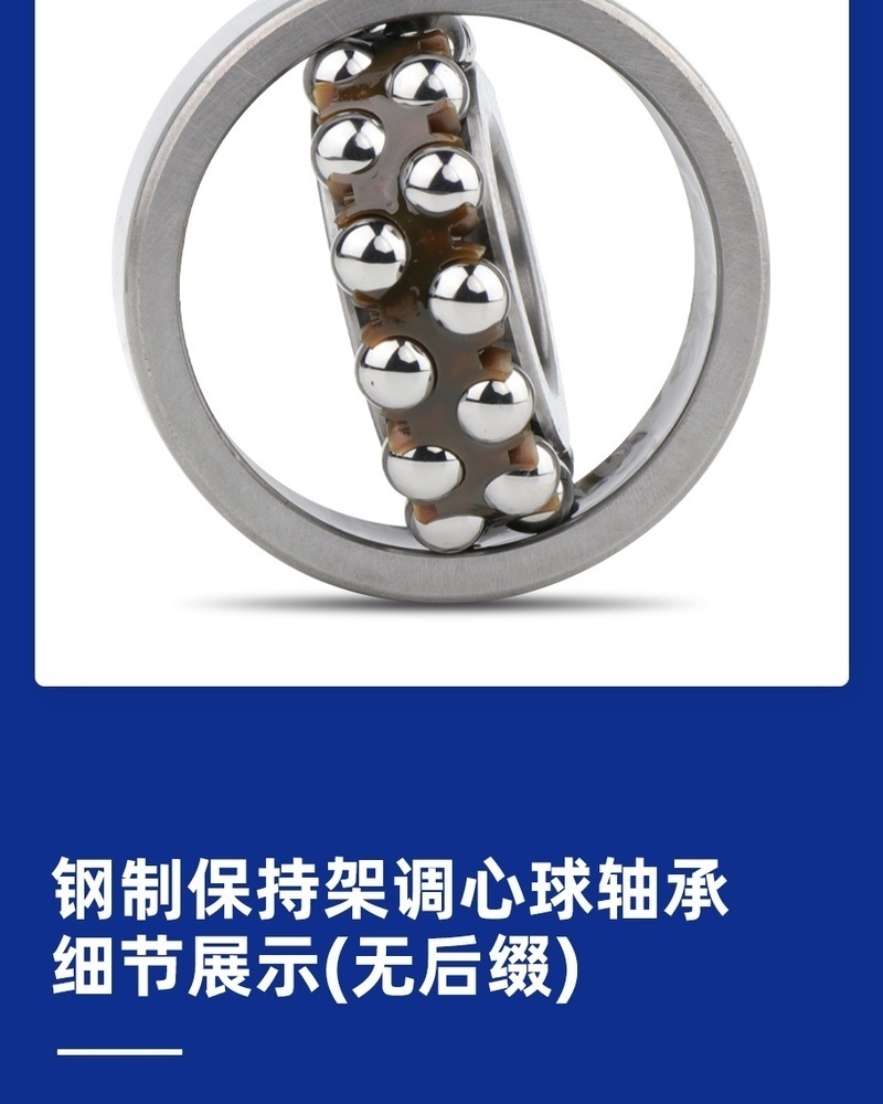 结构设计:调心球轴承结构,能自动补偿轴与轴承座之间的角度不对中(允许一定角度偏差),适应轴的挠曲变形场景