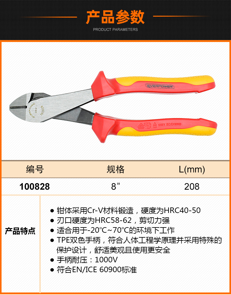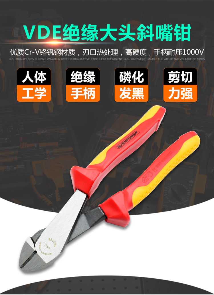 EVERPOWER(艾威博尔),双色柄VDE绝缘大头斜嘴钳8",100828
