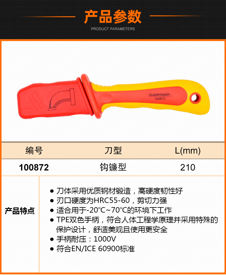EVERPOWER(艾威博尔),双色柄VDE绝缘钩镰型电缆刀210mm,100872