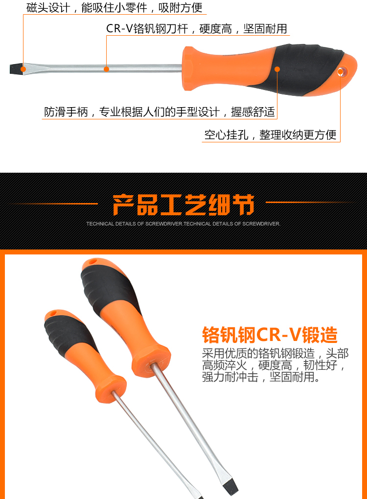 1 高硬度CR-V材料:采用优质铬钒钢CR-V锻造,经过高频淬火处理,硬度达到HRC50-58,确保刀头具有高硬度和良好韧性,强力耐冲击,坚固耐用。