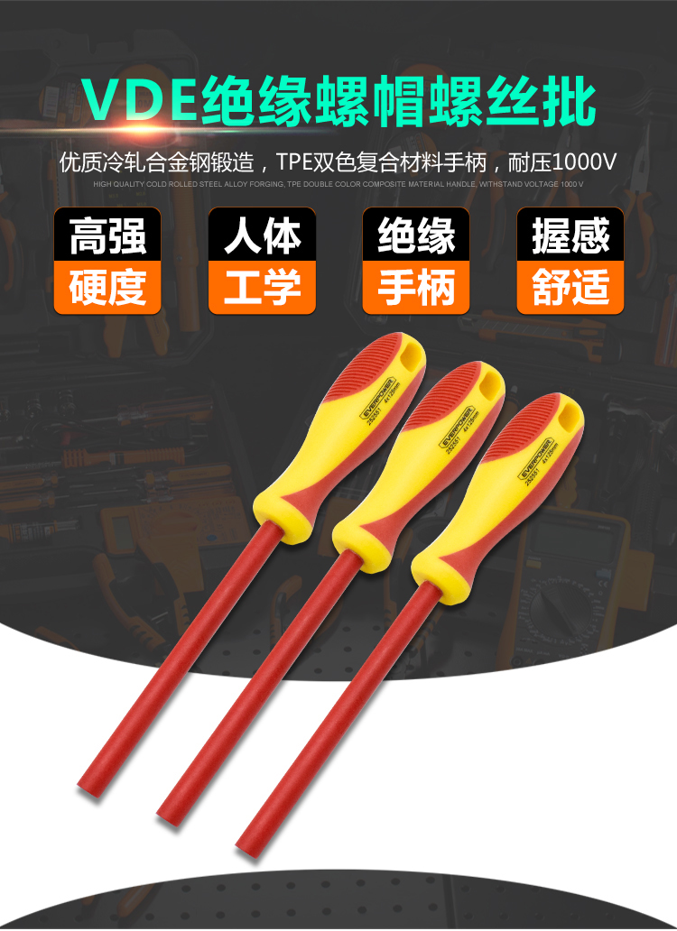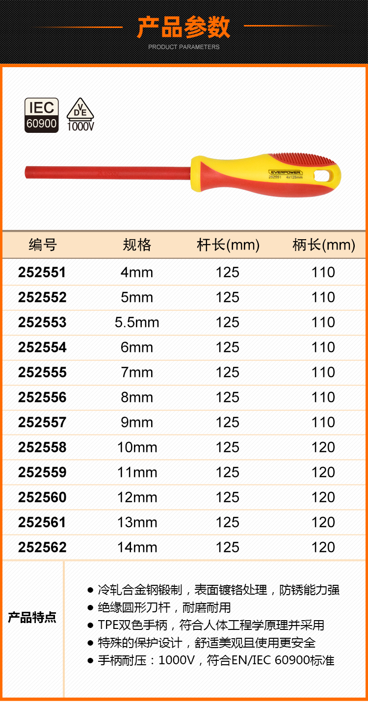 EVERPOWER(艾威博尔),双色柄VDE绝缘螺帽螺丝批8mm,252556
