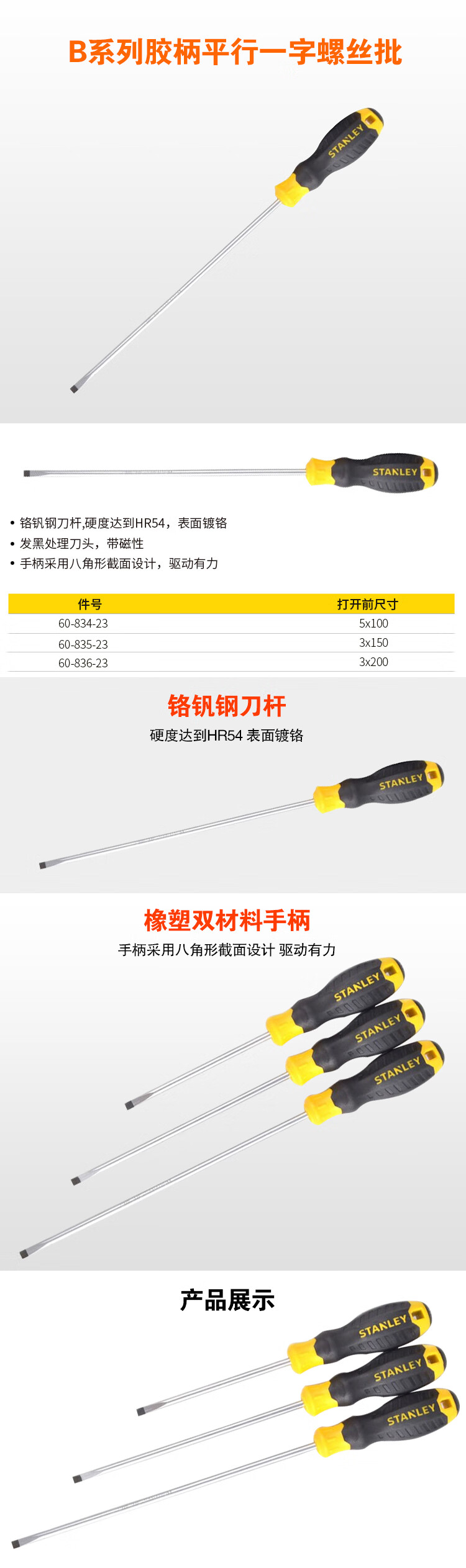 该款STANLEY B系列胶柄平行一字螺丝批广泛应用于机械、电子、汽车维修、家具组装等多个领域。在机械行业中,它可用于设备的日常维护和检修;在电子产品装配中,它能精准地拆装小型元件;在汽车维修领域,它适用于各种车型的零件拆卸与安装;在家具组装时,它能轻松应对各种一字螺丝的紧固需求。其磁性刀头设计特别适合在狭小空间或难以触及的位置进行操作,有效解决了传统螺丝批在这些环境下的使用难题。