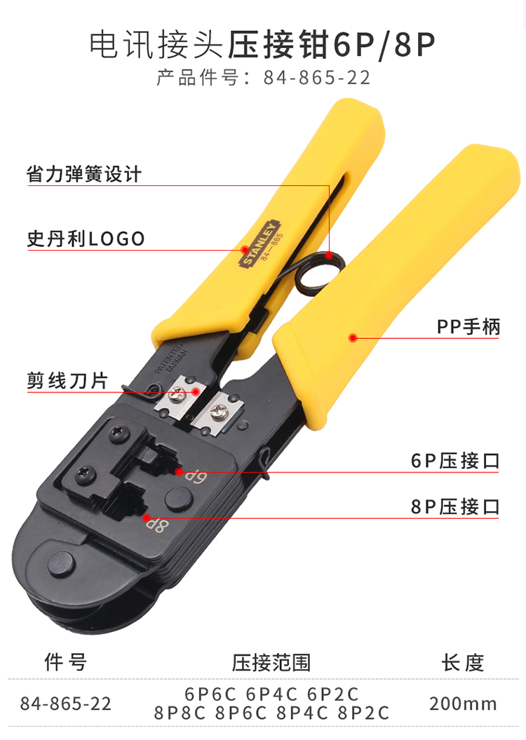 STANLEY(史丹利)电讯接头压接钳6P/8P 200mm(型号:84-865-22)具有以下特点: