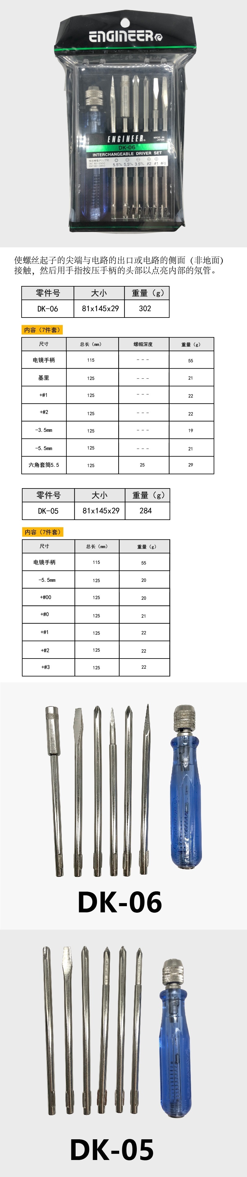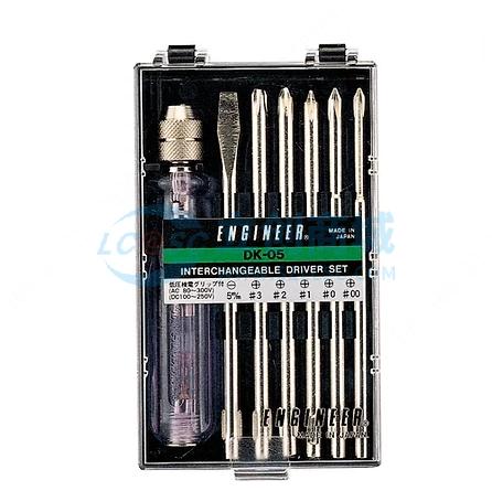 品牌ENGINEER,型号DK-05,为7件套可互换螺丝刀套装,包含电镜手柄及多种规格批头