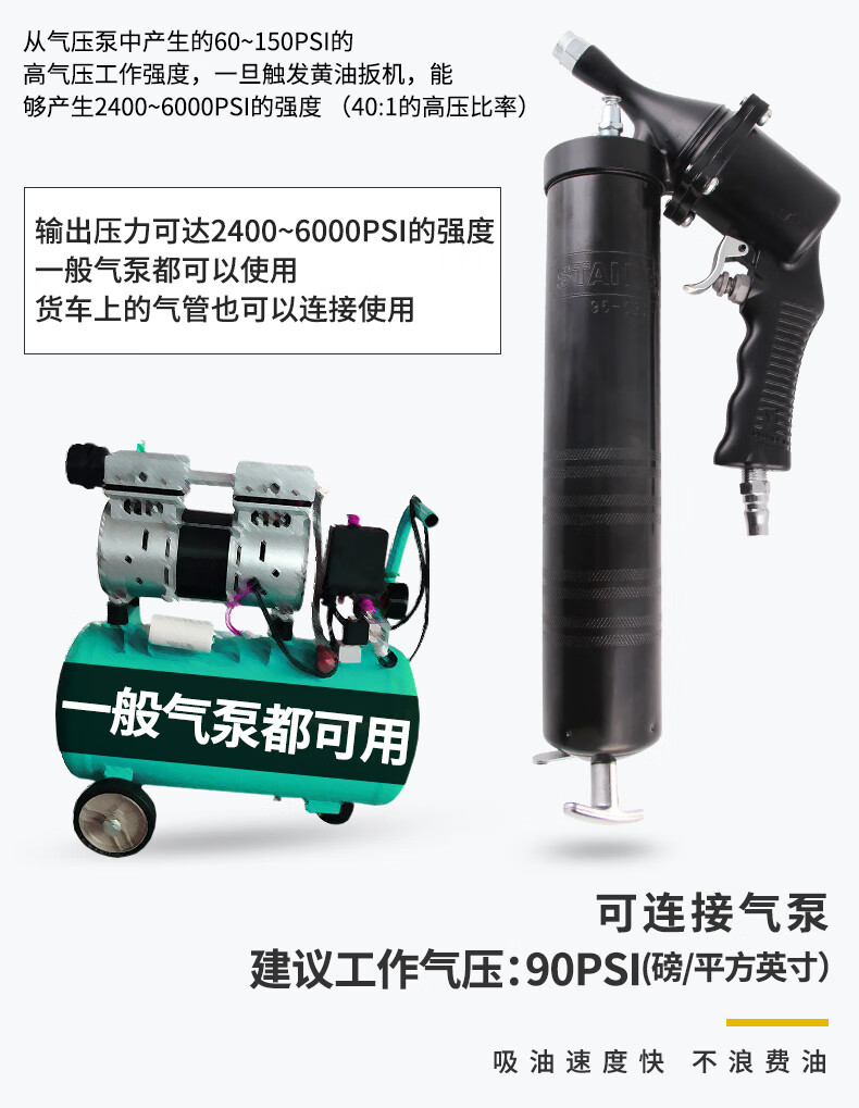 6 适用性强:可连接一般气泵,建议工作气压为90PSI,吸油速度快,不浪费油,适用于多种润滑场景。