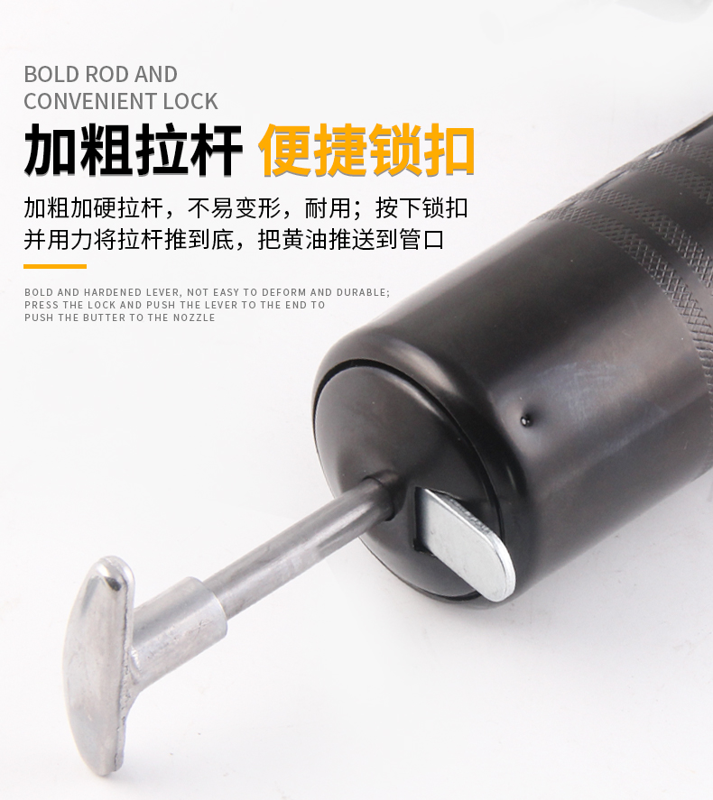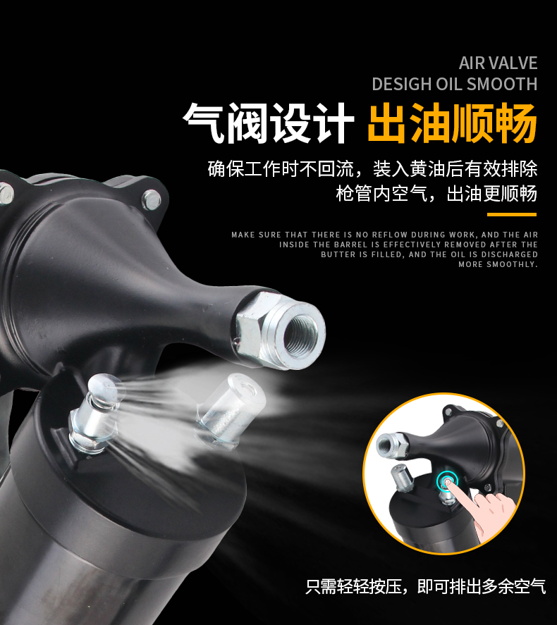 5 安全可靠:气阀设计确保工作时不回流,装入黄油后有效排除枪管内空气,出油更顺畅,安全锁扣设计增加使用安全性。