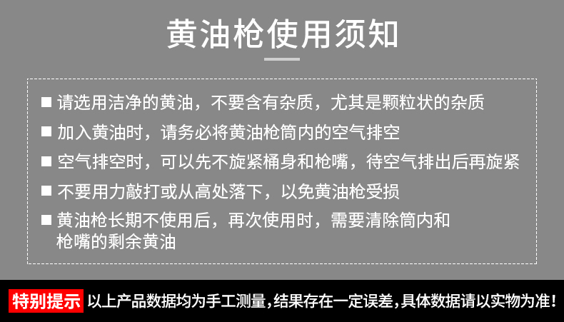 1 请选用洁净的黄油,避免含有杂质,尤其是颗粒状杂质,以防止堵塞枪嘴。