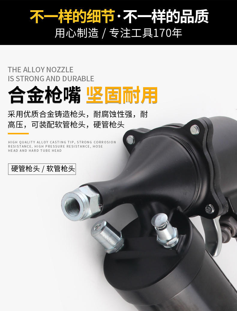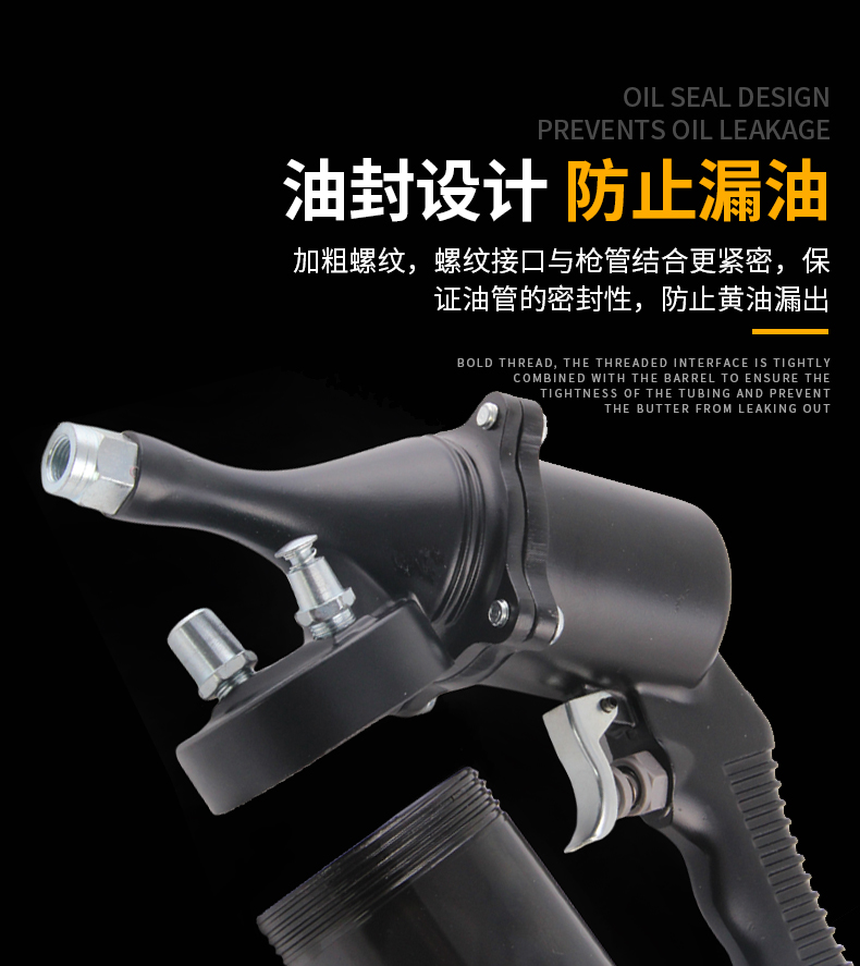 4 密封性好:油封设计防止漏油,加粗螺纹接口与枪管紧密结合,确保油管密封性,避免黄油泄漏。