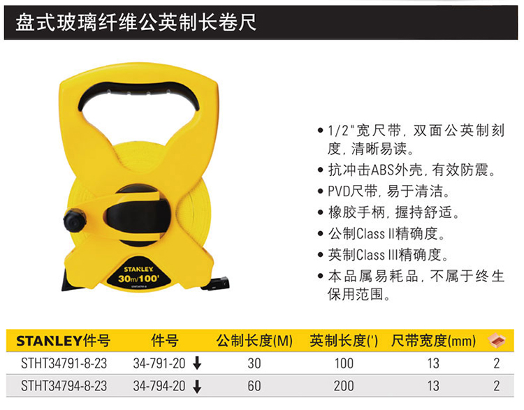 STANLEY(史丹利),盘式公英制玻璃纤维长卷尺30M/100',STHT34791-8-23