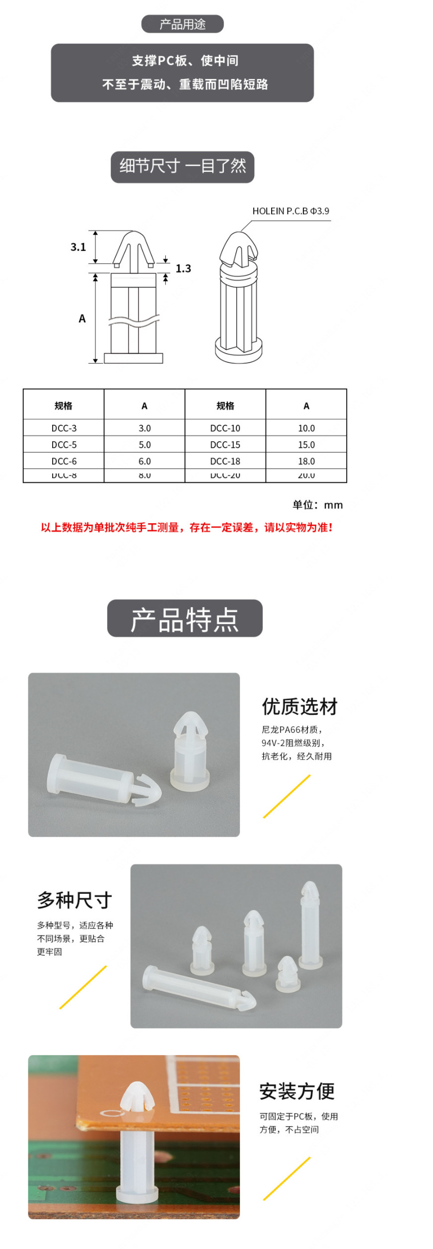 2 规格为M3.9×6mm,适配PCB板孔径3.9mm,间隔距离6mm,可有效支撑PC板