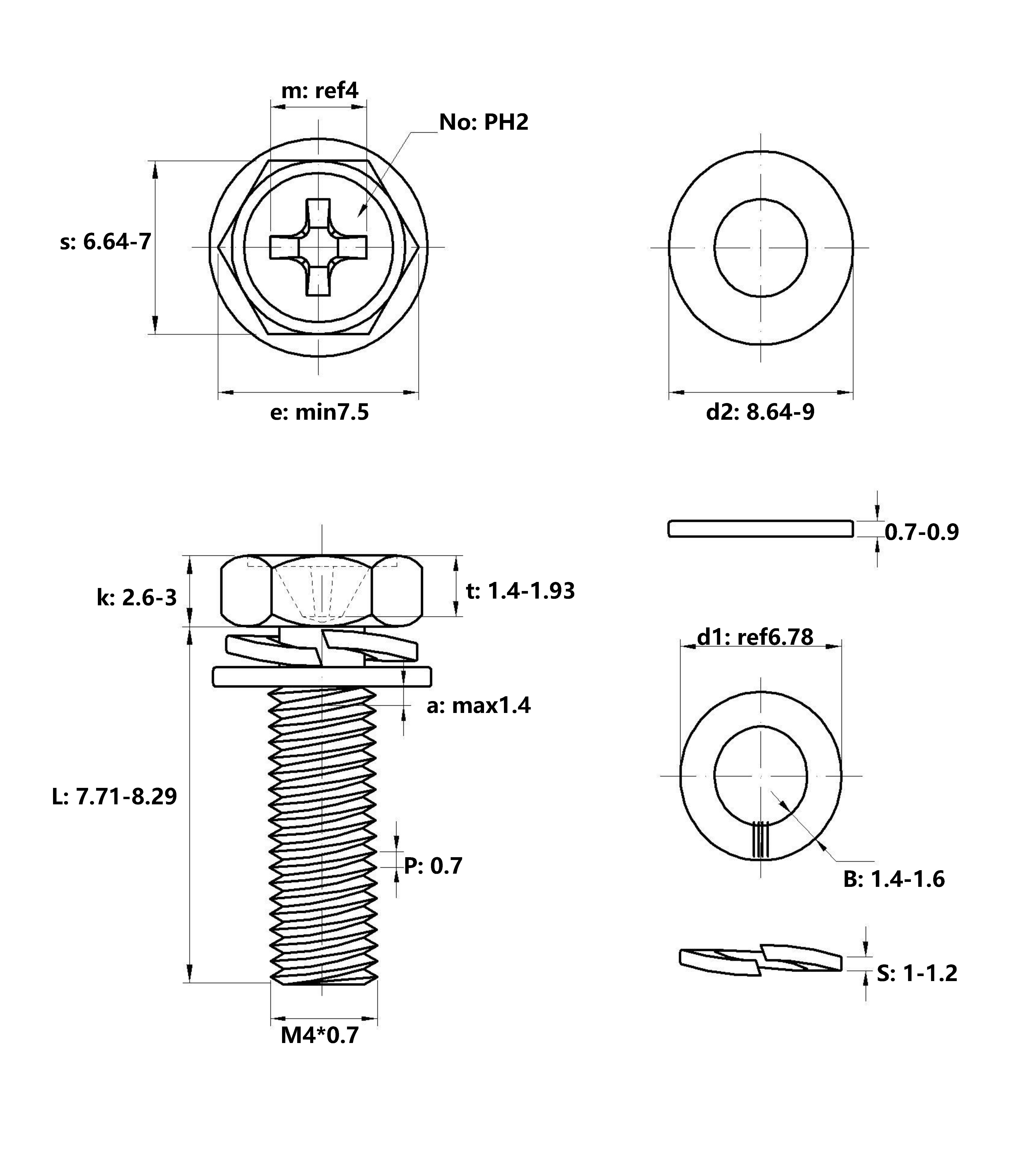 8 配套组合平垫外径8.64-9.0mm,内径3.66-3.78mm,厚度0.7-0.9mm,可均匀分散压力,避免被连接件表面压伤