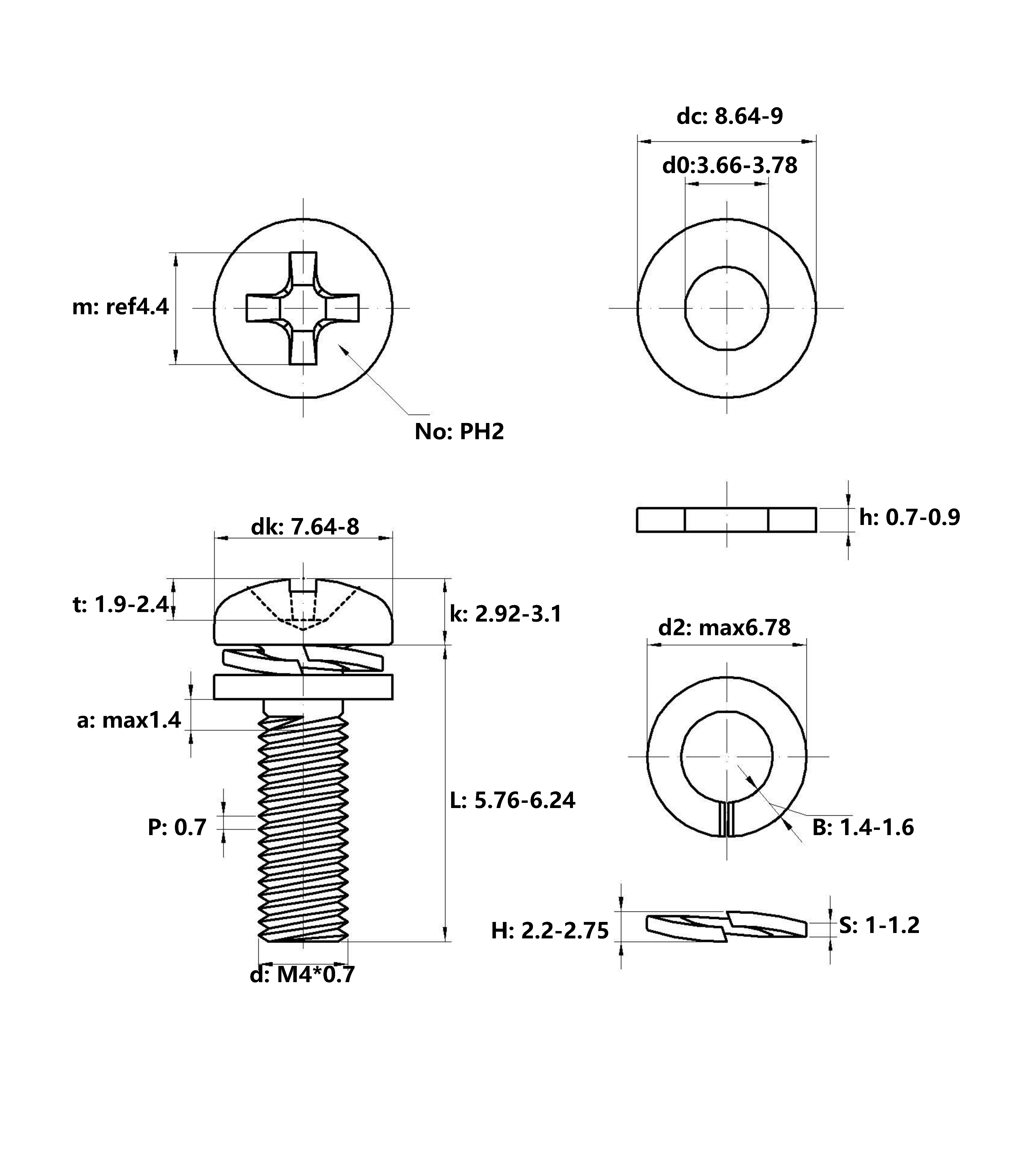 9 组合弹垫内径3.6-3.78mm,自由高度2.2-2.75mm,厚度1.0-1.2mm,宽度1.4-1.6mm,具备优良的弹性锁紧功能,防止松动