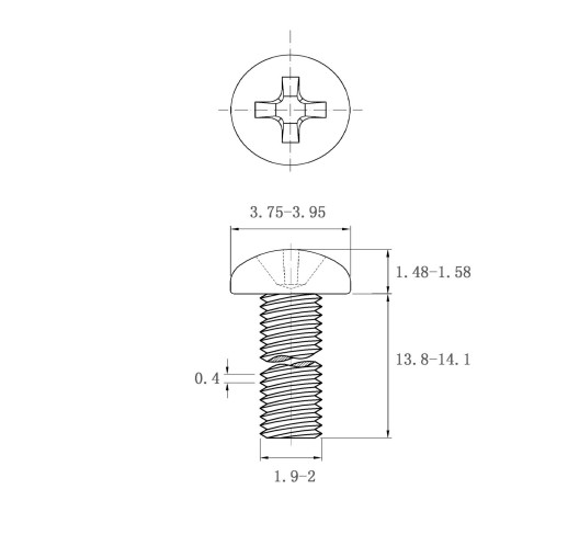 规格为M2×14,公称长度13.8-14.1mm,牙外径1.9-2mm,牙距0.4mm,采用标准机械牙型(60°牙尖角),确保螺纹配合精度高、旋合顺畅
