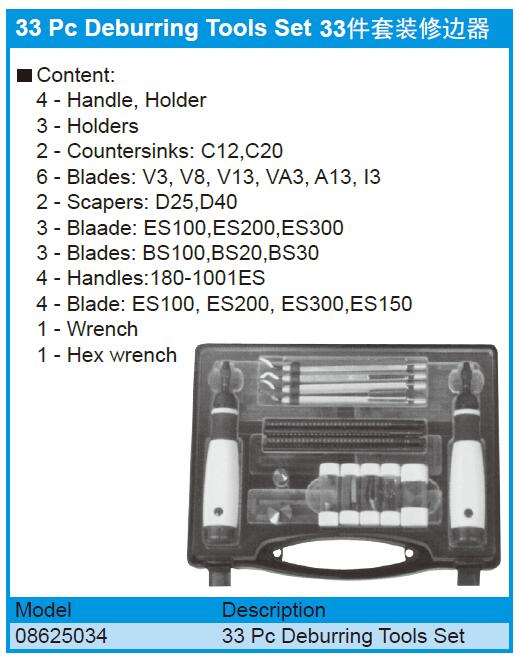 1 组件齐全:包含4个手柄、3个夹持器、2个锪孔器、6个刀片、2个刮刀、3个ES系列刀片、3个BS系列刀片、4个ES系列刀片(不同规格)、1个扳手和1个内六角扳手,满足多种去毛刺需求。