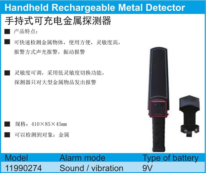 可快速检测金属物体,使用方便,灵敏度高,报警方式有声光报警和振动报警