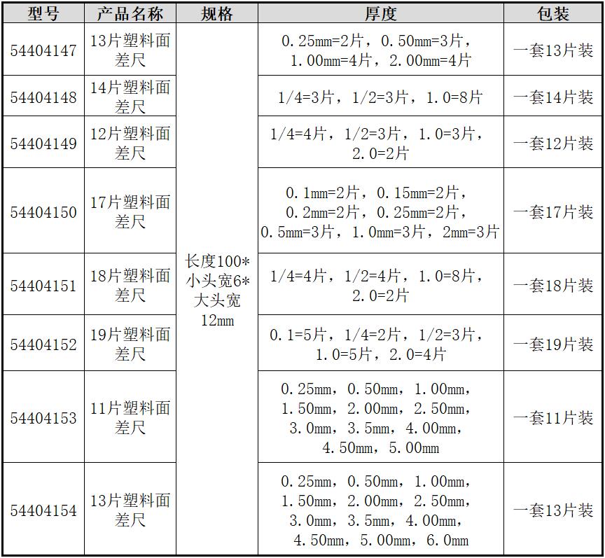 4 标准规格:每套包含4片1/4mm,3片1/2mm,3片1.0mm,2片2.0mm,覆盖常见测量范围。