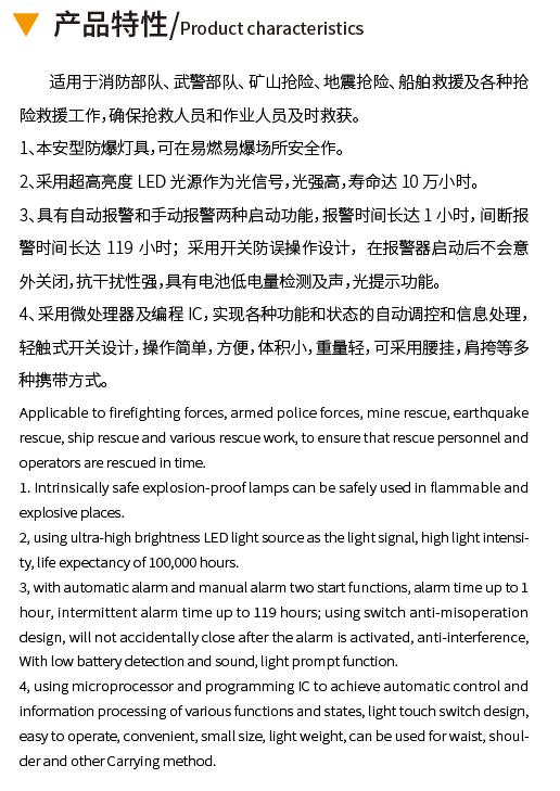 3 具备自动报警和手动报警两种启动功能:持续报警时长可达1小时,间断报警时长可达119小时;开关采用防误操作设计,报警启动后不会意外关闭,抗干扰性强