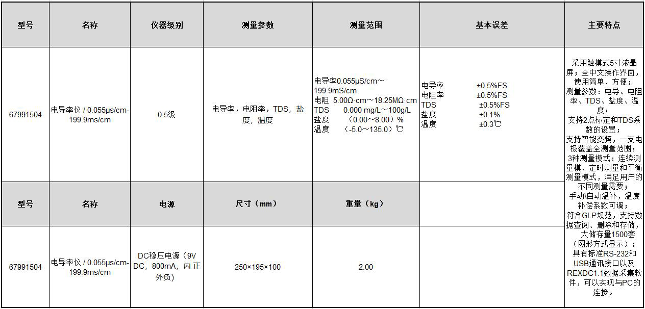测量范围覆盖广:电导率0.055μS/cm~199.9mS/cm,电阻率5.00Ω·cm~18.25MΩ·cm,TDS 0.000mg/L~100g/L,盐度0.00~8.00%,温度-5.0~135.0℃