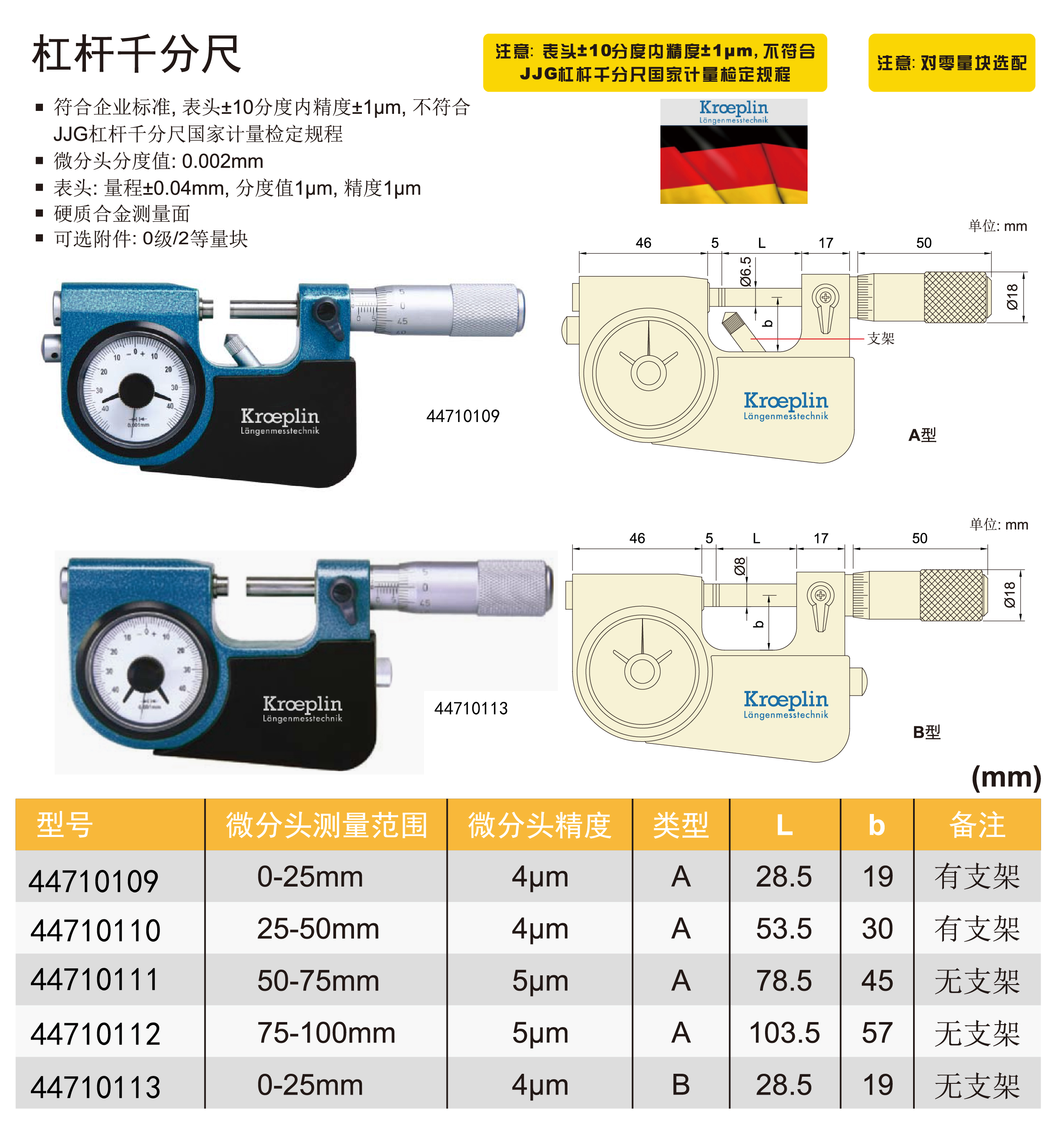kroeplin/凯普林 杠杆千分尺 44710109具有以下特点: